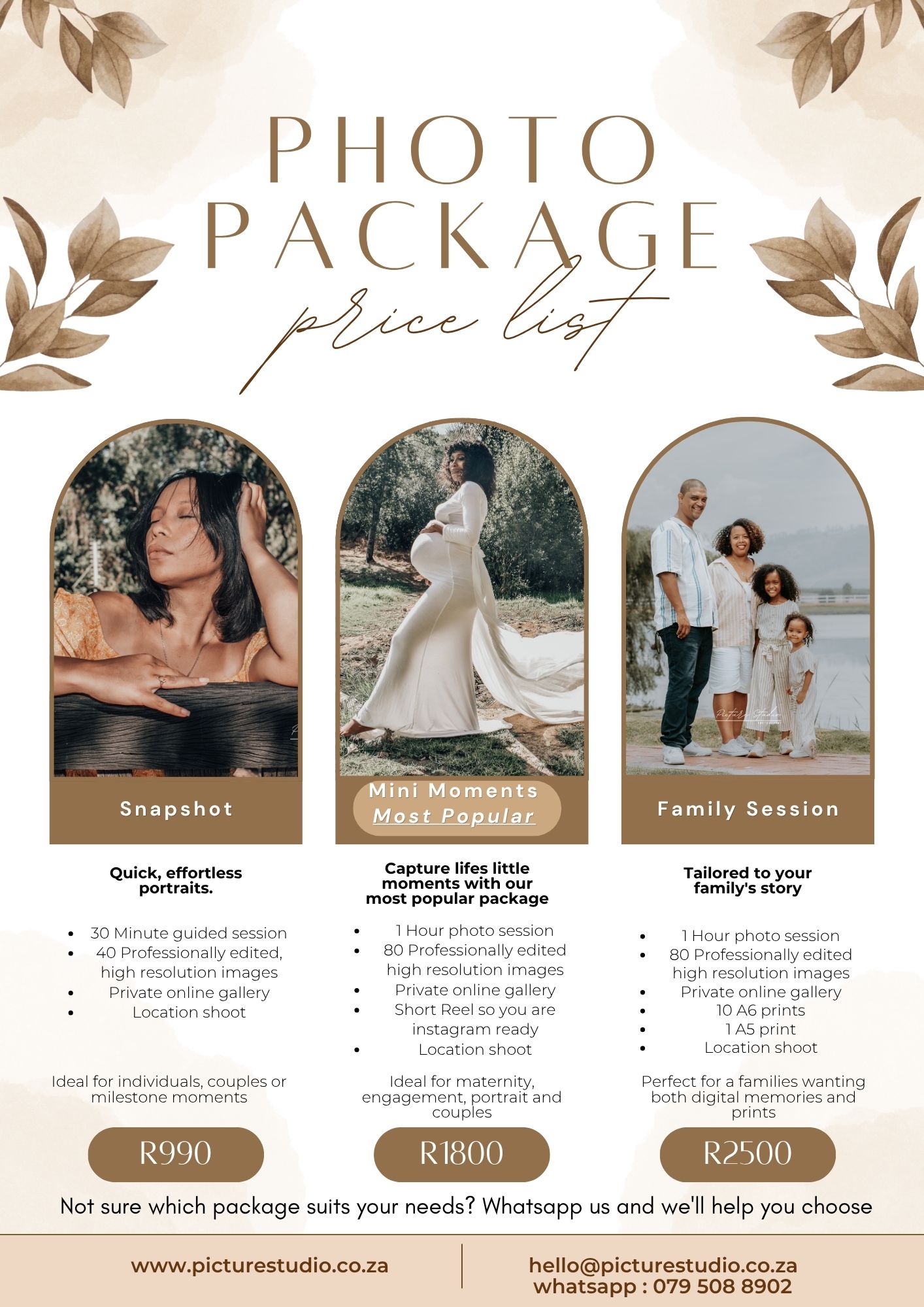 - Technical Difficulties (Studio Bookings): Unfortunately load shedding is a real problem in South Africa. In the case of a power outage or lack of electricity for any reason, Photographer reserves the right to stop shooting, and alternatively grant a reshoot on an agreed date as soon as possible free of charge. Photographers can- and will not photograph in low-light conditions with a camera flash, as this will result in poor-quality images.